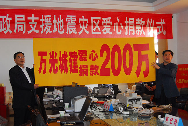 在回饋社會的路上,萬光城建從未停止腳步。多年來,萬光城建身體力行投身各種社會公益活動,向煙臺市紅十字會、煙臺大學、煙臺向日葵殘疾兒童基地、煙大附小等單位及社會弱勢群體踴躍奉獻愛心……特別是在“5?12”汶川地震發(fā)生后,萬光城建傾企業(yè)與員工所能,第一時間捐資205萬元,創(chuàng)下連續(xù)5日全市企業(yè)捐款數(shù)額之佳,生動詮釋了“責任企業(yè)、責任地產(chǎn)”的深刻內(nèi)涵。