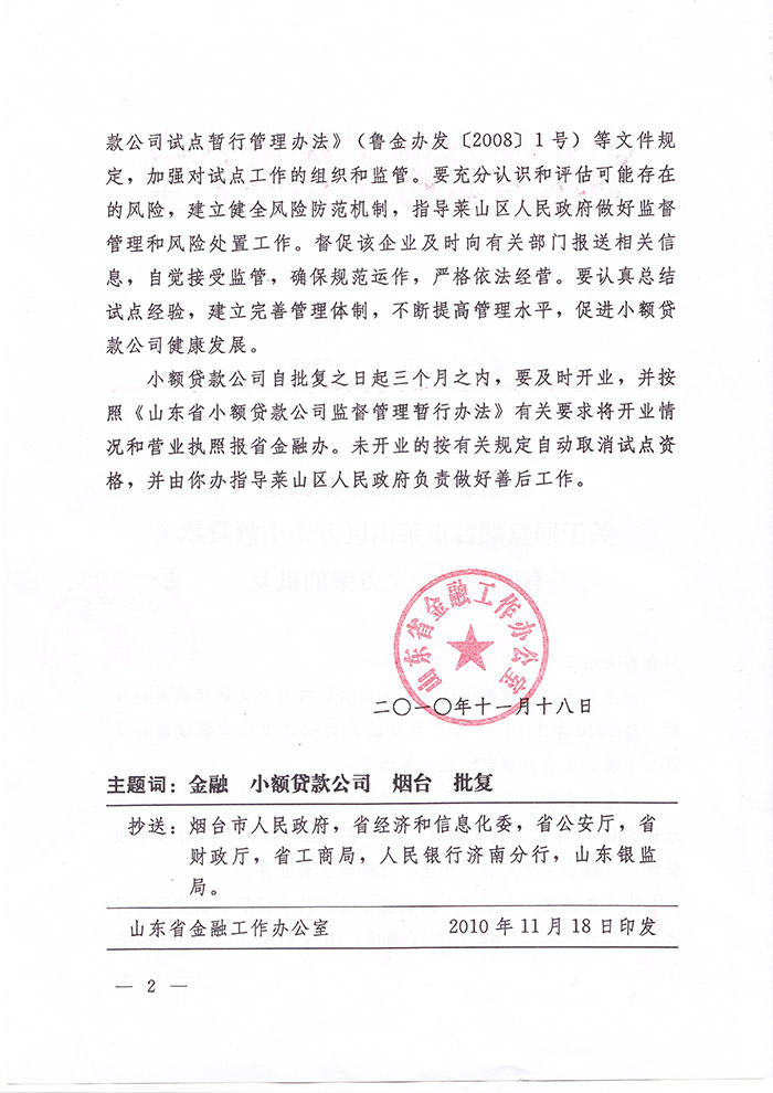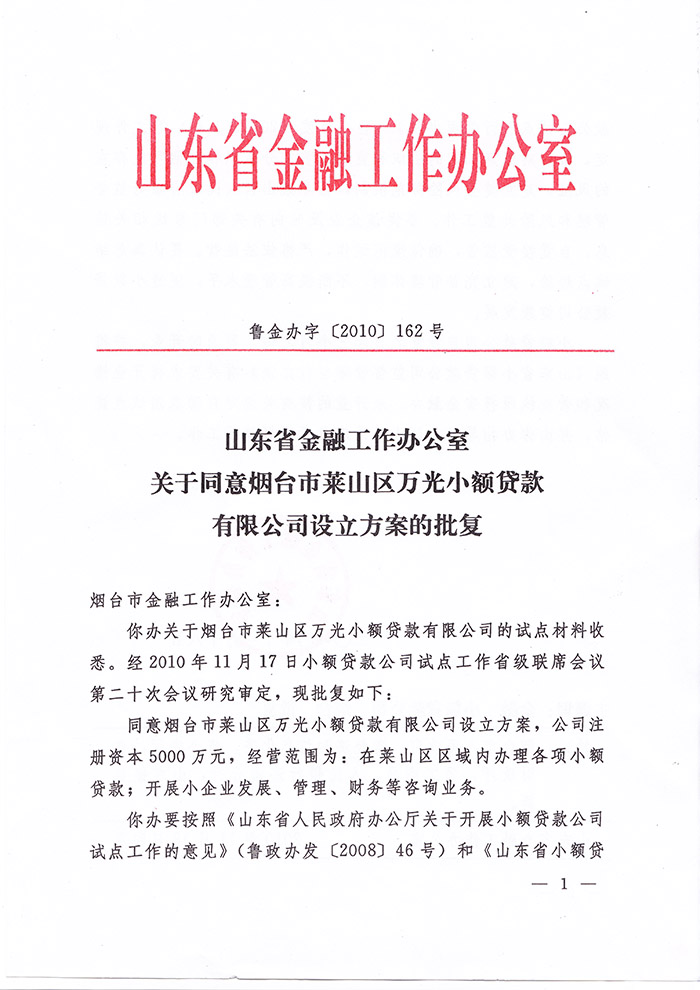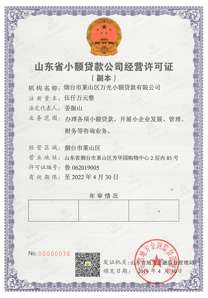 煙臺(tái)市萊山區(qū)萬(wàn)光小額貸款有限公司是萊山區(qū)唯一一家經(jīng)山東省金融工作辦公室“魯金辦[2010]162號(hào)文”批準(zhǔn)成立,依法在工商部門登記注冊(cè)的小額貸款公司。公司為山東省小額貸款企業(yè)協(xié)會(huì)理事單位,注冊(cè)資金5000萬(wàn)元,于2011年1月正式營(yíng)業(yè),從業(yè)人員全部取得小額貸款公司從業(yè)人員資格證書,持證上崗率100%。公司在董事長(zhǎng)姜松青同志帶領(lǐng)下,堅(jiān)持“穩(wěn)健、優(yōu)質(zhì)、高效”的經(jīng)營(yíng)方針,堅(jiān)守合規(guī)經(jīng)營(yíng),圍繞風(fēng)險(xiǎn)防范、穩(wěn)健發(fā)展經(jīng)營(yíng)策略,堅(jiān)持風(fēng)險(xiǎn)防控與經(jīng)濟(jì)效益統(tǒng)籌、風(fēng)險(xiǎn)防控第一的原則,公司以服務(wù)“三農(nóng)”和 小企業(yè)及個(gè)體經(jīng)營(yíng)者為目標(biāo),為中小型企業(yè)、個(gè)體工商戶流動(dòng)資金緊缺和在創(chuàng)業(yè)中暫時(shí)遇到困難的個(gè)人提供信貸支持與幫助,致力于成為本區(qū)域一流的小額信貸業(yè)務(wù)服務(wù)企業(yè)。
